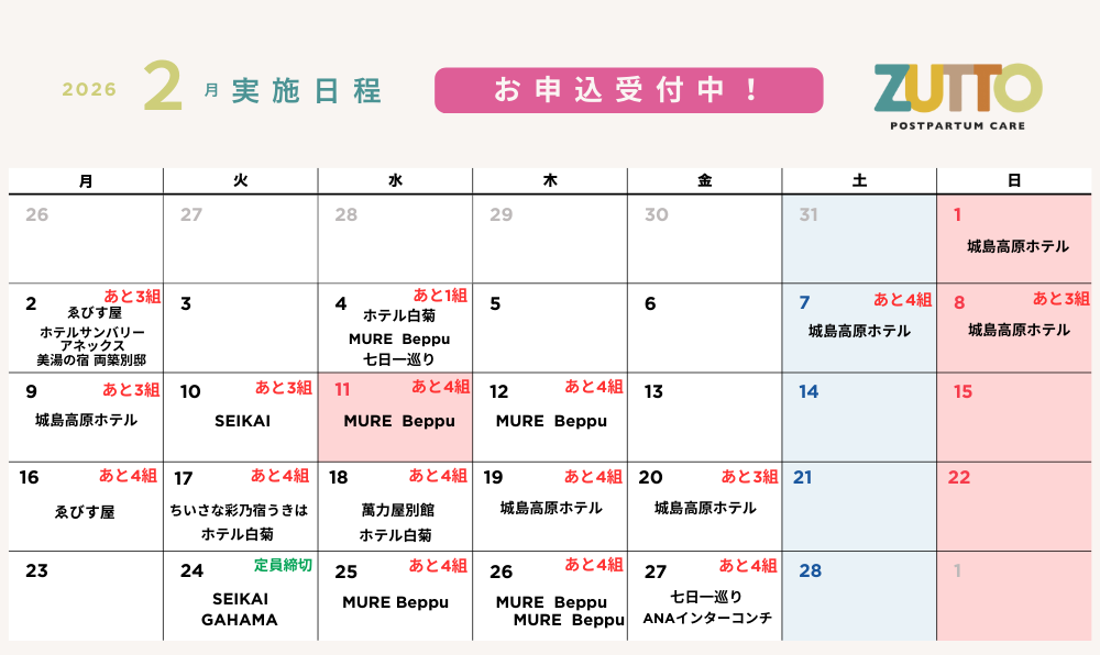 トピックスTOPICS 2025-12-26 ZUTTO<第5弾>再募集受付中!! 2025-12-02 「ZUTTO」で滞在中の特別オプションメニューをご紹介します! 2025-12-01 2月「ZUTTO」第5弾募集スタート! 2025-11-20 ZUTTO <1月実施分> 再募集を開始しました! 2025-11-01 ZUTTO 申し込み方法 2025-11-01 1月「ZUTTO」第4弾募集スタート! 2025-10-30 12月受付中~確定まであとわずかの施設紹介~ 2025-10-25 12月受付中~確定まであとわずかの施設紹介~ 2025-10-01 12月「ZUTTO」第3弾募集スタート! 2025-09-30 【再募集中】11月実施分の再募集を行っています。 2025-08-27 【追加募集】「ZUTTO」御宿ゑびす屋 さま、10月 利用者募集中です! 2025-08-26 【再募集!】10月実施分の再募集開始 2025-08-04 【追加募集】「ZUTTO」両築別邸 さま、9月・10月 利用者募集中です! 2025-07-23 ZUTTO公式LINE 友だち募集中! 2025-07-21 10月「ZUTTO」実施カレンダー 2025-07-21 9月「ZUTTO」実施カレンダー 2025-07-20 「ZUTTO」利用者を7/21(月)より募集します!(9月・10月実施分) 2025-06-25 7月1日(火)より令和7年度の情報が公開されます 2024-12-15 ZUTTO 2月実施スケジュール 2024-12-15 「ZUTTO」第2弾申込み受付を12/16(月)より開始します! 2024-11-21 ZUTTO 1月実施スケジュール 2024-11-19 よくある質問